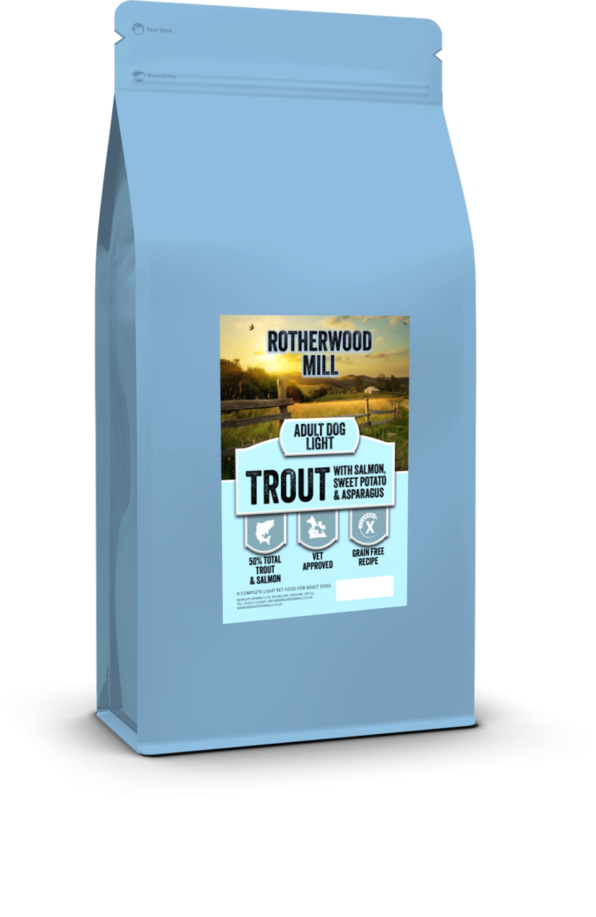 Trout & Salmon 50% (including Freshly Prepared Trout 30%, Dried Salmon 11%, Freshly Prepared Salmon 4%, Salmon Oil 3%, Salmon Stock 2%), Sweet Potato (24%), Potato, Peas (6%), Beet Pulp, Pea Protein, Linseed, Potato Protein, Minerals, Vitamins, Vegetable Stock, Asparagus (0.3%), Glucosamine (170 mg/kg), Methylsulfonylmethane (170 mg/kg), Chondroitin Sulphate (125 mg/ kg), FOS (96 mg/kg), MOS (24 mg/kg)