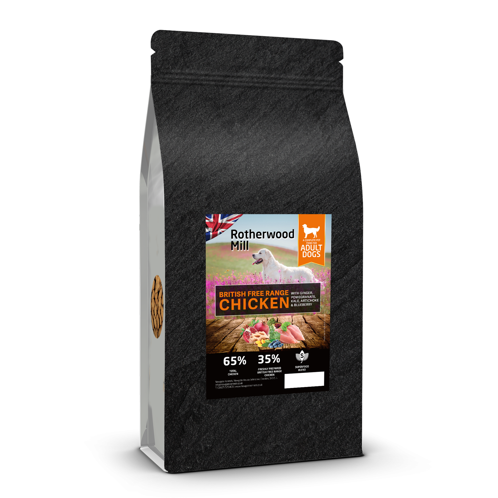65% Chicken (35% Freshly Prepared British Free Range Chicken, 22% Dried Chicken, 6% Chicken Fat, 2% Chicken Gravy), Sweet Potato, Beans, Beet Pulp, Dried Superfood Blend* (Including Ginger, Pomegranate, Kale, Artichoke, Blueberry), Omega 3 Supplement, Minerals, Fructooligosaccharides (FOS, 192 mg/kg), Mannanoligosaccharides (MOS, 48 mg/kg), Olive Extract (0.01%)